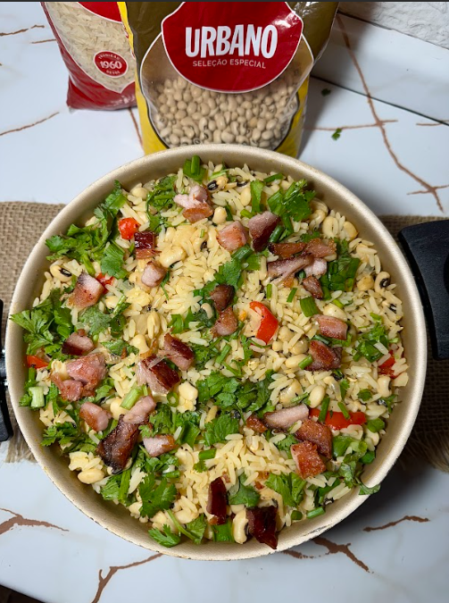 Deixe o feijão de molho em água quente por aproximadamente 2 horas. Após esse tempo, leve-o para cozinhar (sem usar a panela de pressão), apenas com sal, até que fique macio. Em uma outra panela, doure a cebola no óleo. Adicione o arroz e o feijão cozido, misturando bem. Acrescente o pimentão, a pimenta, os temperos de sua preferência, o sal e a água do cozimento do feijão. Deixe cozinhar até que o arroz esteja no ponto. Finalize com cheiro-verde e bacon frito por cima. Bom apetite!