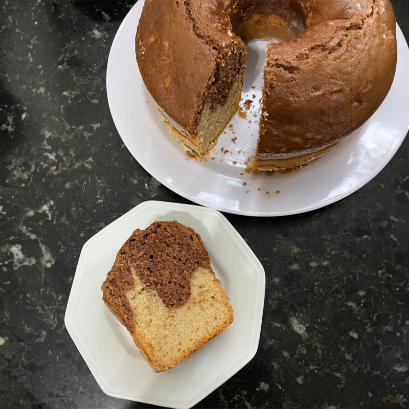 Divida a massa em partes iguais e em uma das partes coloque o achocolatado em pó. Misture bem. Em uma forma untada com óleo e farinha, adicione a massa branca e em seguida a massa de chocolate por cima. Leve para assar em forno pré-aquecido a 200°C por 45 minutos ou até que o bolo fique seco no teste do palito. Espere esfriar ou pelo menos amornar para desenformar e servir.