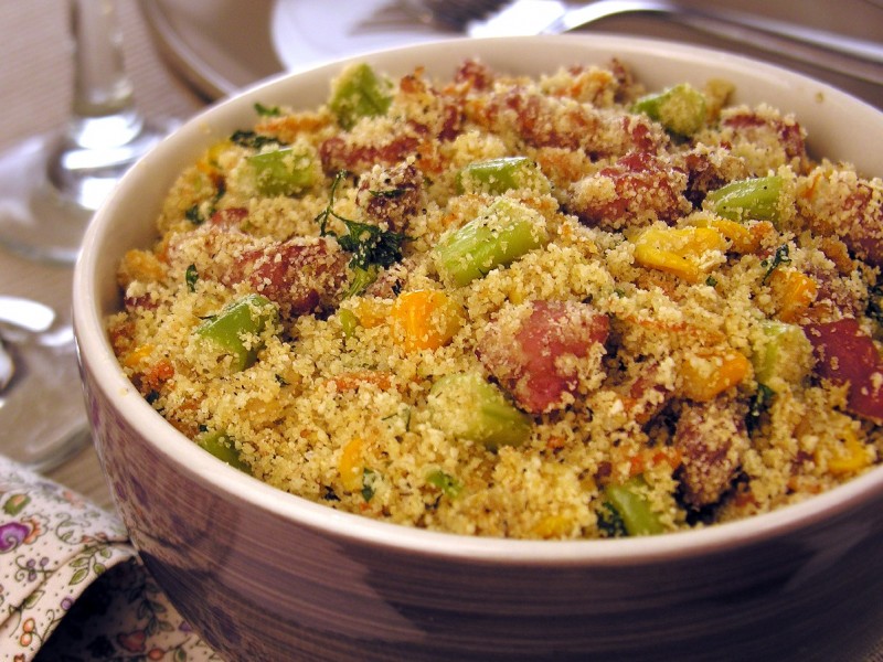 Em uma panela, coloque o bacon para fritar(não é necessário óleo), depois acrescente a calabresa. Quando estiver dourado, junte a manteiga com a cebola picada e refogue, até a cebola ficar transparente. Tempere com sal a gosto. Junte a farinha de mandioca, sempre mexendo até obter a coloração dourada de uma farofa comum. Junte a salsa e mexa por alguns minutos. Retire do fogo e junto os ovos picados. Sirva com o Arroz Urbano de sua preferência.