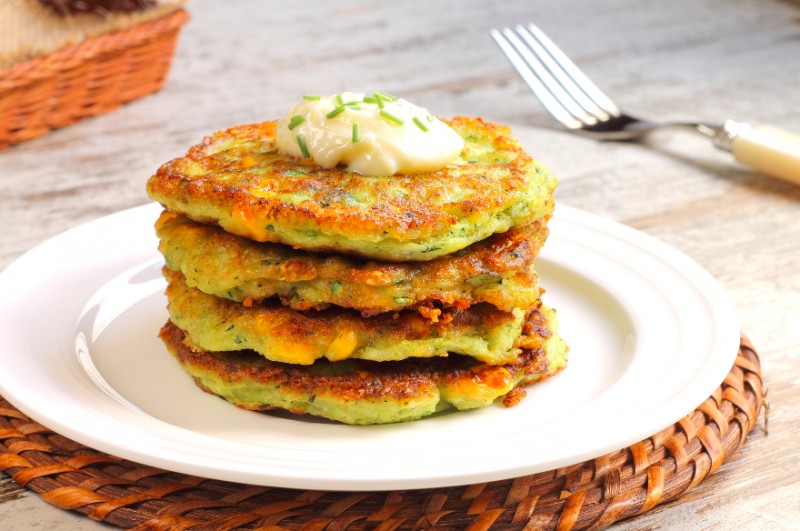 Retire o excesso de água das abobrinhas com papel-toalha. Misture a abobrinha com os demais ingredientes em uma tigela, com exceção do azeite. Aqueça a frigideira antiaderente em fogo médio. Unte com um pouquinho de azeite e despeje a massa sobre a frigideira, formando um disco de cerca de 1 centímetro de espessura. Deixe dourar dos dois lados e prontinho!