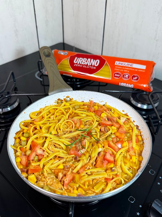 Cozinhe 80 g de Linguine Urbano por cerca de 8 minutos. Em uma frigideira, doure a cebola e o alho. Adicione o molho de tomate e misture. Acrescente o frango, a ervilha e o milho. Misture bem. Coloque o requeijão light e mexa até ficar cremoso. Junte o macarrão cozido e envolva tudo no molho. Finalize com os temperos e o tomate picado. Bom apetite!