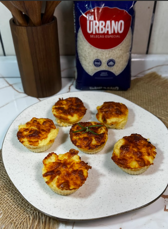 Cozinhe o Arroz Branco Tio Urbano da forma que você está acostumado. Em um recipiente, coloque o ovo, o arroz cozido e um pouco de água. Bata tudo com um mixer até obter uma massa homogênea. Adicione o fermento e misture delicadamente com uma colher. Em forminhas de silicone, coloque metade da massa. Adicione o recheio de sua preferência (frango, carne moída, atum ou o que você gostar). Cubra com o restante da massa. Finalize com queijo muçarela. Leve para a airfryer à 160°C até assar e dourar. Bom apetite!