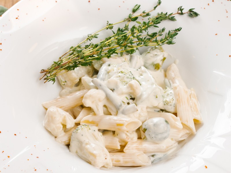 Primeiro, cozinhe o Macarrão de Arroz Urbano Pena de acordo com as instruções da embalagem. Em um liquidificador, bata a couve-flor cozida com leite até ficar bem cremosa. Despeje a misture na panela e adicione o parmesão, sal, pimenta do reino e noz moscada. Aqueça e cozinhe, mexendo, até o queijo derreter. Decore com tomilho se quiser. Prontinho!