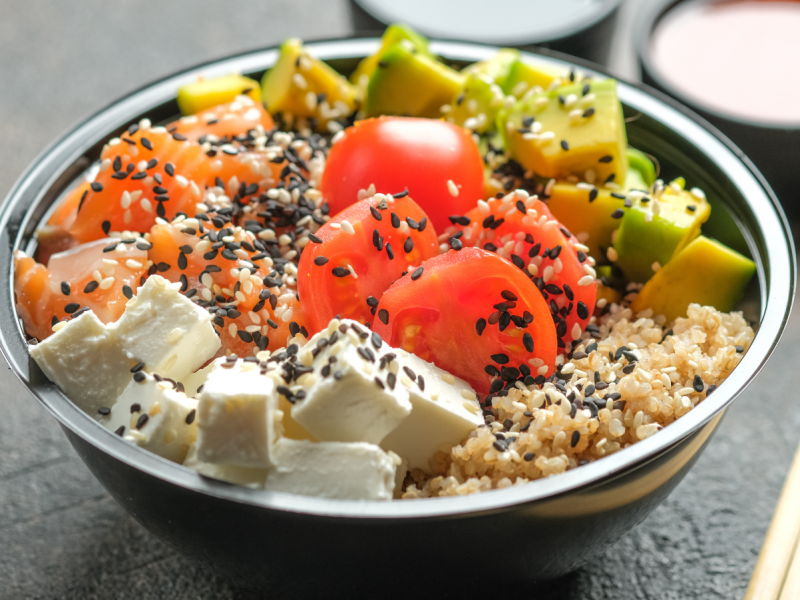 Em uma panela, coloque um fio de azeite, a Quinoa Urbano lavada e adicione água até cobrir. Deixe cozinhar por cerca de 15 minutos ou até a quinoa ficar macia e seca. Tempere com uma pitada de sal e reserve. Em uma cumbuca, monte o poke colocando a quinoa cozida, os cubos de abacate, os cubos de salmão, o queijo e, por cima, os tomates cortados ao meio. Tempere com um fio de azeite, sal e pimenta-do-reino a gosto. Se preferir, finalize com sementes de gergelim. Bom apetite!