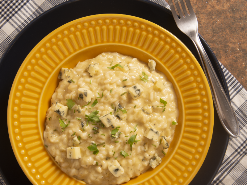 Coloque o caldo de legumes para esquentar em uma panela média, mantendo o caldo aquecido. Em outra panela em fogo médio, coloque a manteiga, a cebola e frite até começar a dourar. Adicione o Arroz Arbório Urbano e frite, mexendo por 1 minuto. Após, adicione o vinho e misture. Com a panela destampada, deixe ferver até que todo o líquido tenha sido absorvido. Coloque o caldo de legumes aos poucos, o sal e cozinhe, misture bem, sempre em fogo alto. Quando o caldo se misturar ao arroz, ficando cremoso, adicione o queijo provolone, o queijo muçarela, o queijo parmesão e o queijo gorgonzola. Misture bem e adicione noz-moscada e pimenta-do-reino a gosto. Retire do fogo, coloque em uma travessa e finalize com gorgonzola e cheiro-verde. Sirva imediatamente e bom apetite!