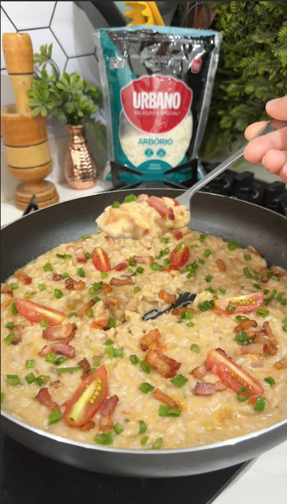 Comece fritando o bacon e, assim que estiver pronto, reserve. Na mesma panela, doure a cebola, o alho-poró e o alho. Acrescente o Arroz Arbório Urbano, refogue um pouco e adicione o vinho, mexendo até que evapore. Em seguida, comece a acrescentar o caldo aos poucos, colocando duas conchas de cada vez e mexendo sempre. Quando o caldo secar, adicione mais e continue mexendo até o arroz atingir o ponto desejado — costumamos deixar al dente. Finalize acrescentando a manteiga e o requeijão, misture bem e depois adicione o queijo. Volte com o bacon, envolva tudo e, para decorar, coloque mais bacon por cima, tomate e cebolinha. Sirva em seguida. Bom apetite!