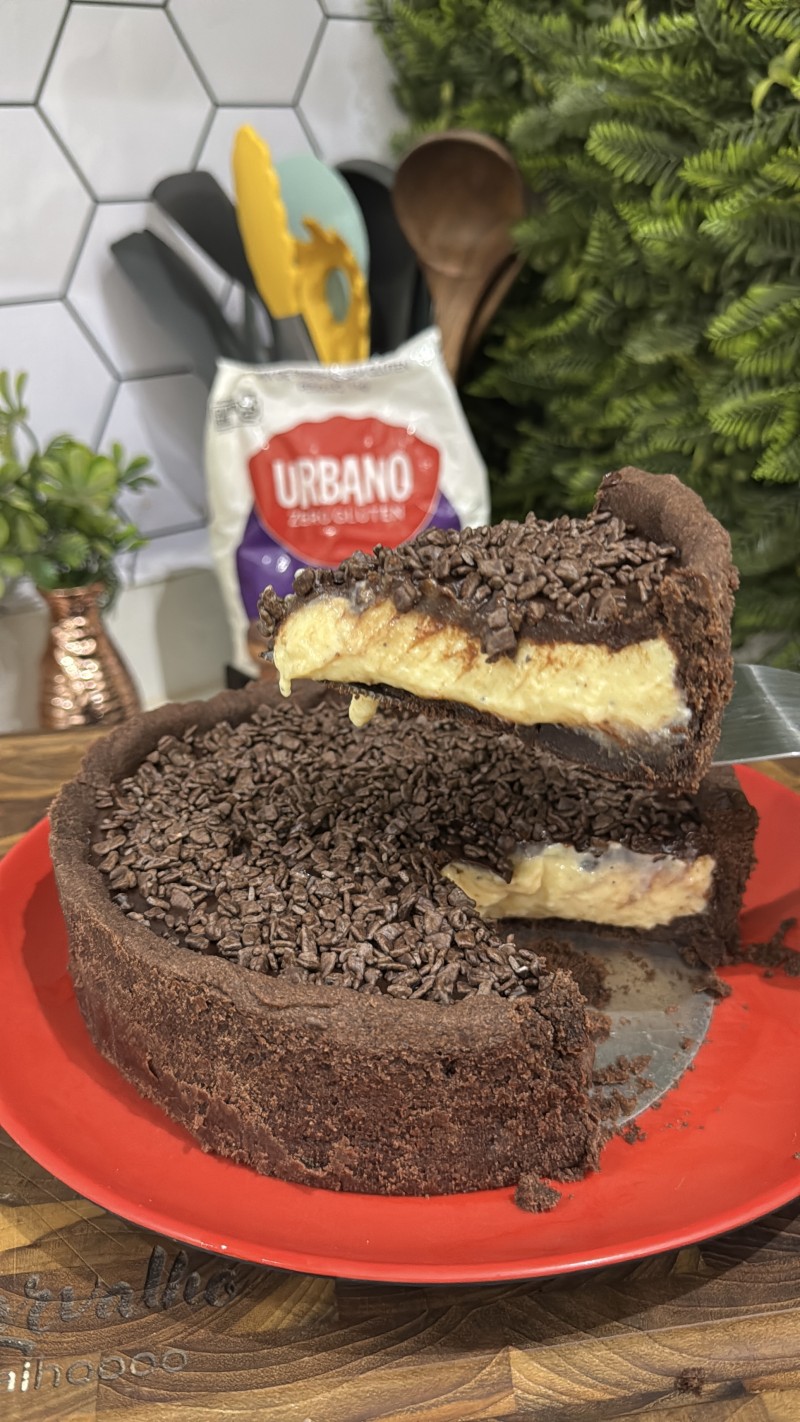 Para a cobertura, derreta o chocolate com o creme de leite, misture bem e despeje sobre a torta. Finalize com granulado e sirva em seguida. Bom apetite!