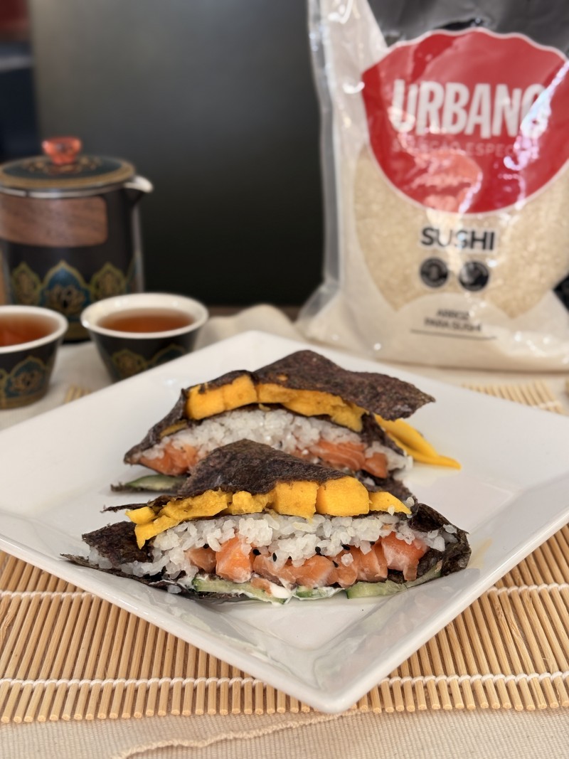 Comece preparando o arroz, seguindo as instruções da embalagem. Prepare o tempero do arroz, com vinagre, açúcar e sal e adicione quando estiver pronto. Cubra com um papel toalha ou pano molhado e deixe na geladeira ou em temperatura ambiente para esfriar. Enquanto o arroz esfria, pique os acompanhamentos da sua escolha. Com tudo pronto, corte uma folha de alga até a metade. Em cada quarto da folha, adicione um recheio diferente variando como gohan, pepino, salmão e manga. Finalize com gergelim por cima do arroz e cream cheese por cima do pepino. Dobre em quatro partes, adicione shoyu a vontade e está pronto. Para ficar mais fácil de consumir, pode cortar no meio. Bom apetite! OBS.: para essa quantia de arroz e salmão, rende em torno de 6 unidades de wrap.